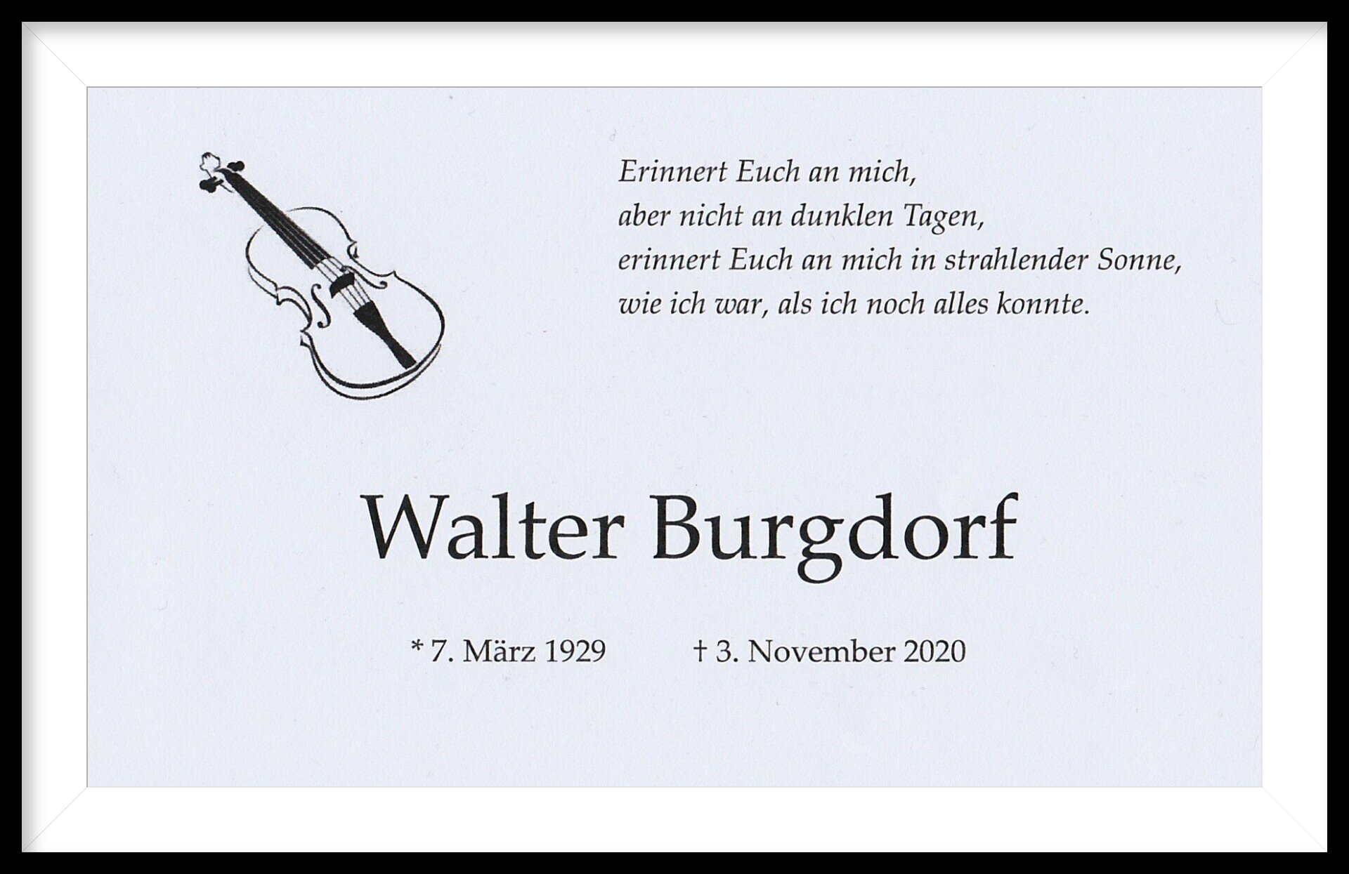 Der Musikverein Himmelsthür trauert um seinen ehemaligen Dirigenten Walter Burgdorf 7.3.1929 – 5.11.2020 Im November 1984 übernahm Walter das Amt des Dirigenten, das er bis zum Dezember 1997 ausübte. Gute 13 Jahre also dauerte sein Dirigat, und es waren gute Jahre, denn sonst hätten Dirigent und Orchester es nicht so lange miteinander ausgehalten. Man passte einfach zusammen. Fördern durch fordern, ohne zu überfordern – so könnte man seine Grundeinstellung beschreiben. Ihm war der Unterschied zwischen einem Profi- und einem Musikvereins-Orchester wohl bewusst: die einen bezahlt man fürs Musizieren (dann haben sie aber auch eine entsprechende Leistung abzuliefern), die anderen machen es aus Freude an der Musik in ihrer Freizeit, da braucht man andere Mittel und Methoden der Motivation. Er war ja selbst Berufsmusiker beim Bundesgrenzschutz-orchester Hannover, aber nicht alle Berufsmusiker sind sich dieses Unterschiedes so bewusst. Selbstverständlich war für ihn eine gewisse Disziplin bei der Probenarbeit – da kam dann doch ein wenig mehr als sonst der Berufsmusiker durch. In einem Musikvereinsorchester hat man (hoffentlich) alle Jahre wieder Neuzugänge von Kindern und Jugendlichen (manchmal auch Erwachsenen), die gerade die ersten Stufen ihrer Musiker-Karriere hinter sich haben, nämlich die Einzelausbildung an ihrem Instrument und die ersten Ensemble-Erfahrungen in der „Vorgruppe“. Dies bedeutet für einen Dirigenten, dass er (insbesondere bei der Gestaltung der Konzertprogramme) eine gute Balance hinbekommen muss zwischen dem Leistungsvermögen des Nachwuchses und den Niveauansprüchen der „alten Hasen“. Hier hatte Walter eine recht gute Hand, auch durch ein „Zückerchen“ für die „alten Hasen“: Kleingruppen-Arrangements (für vier bis sechs Stimmen), die es teilweise schon ganz schön in sich hatten. Dafür wurde für Interessierte auch schon mal an die Probe noch ´ne halbe Stunde drangehängt. Nach seinem Ausscheiden als Dirigent ist uns Walter aber noch etliche Jahre verbunden geblieben – sei es als Aushilfe, wenn in Posaune oder Tenorhorn Not am Mann war, sei es als Verstärkung, wenn für ein in seiner Dirigatszeit aktives Mitglied ein Geburtstagsständchen zu spielen war. Ein langes Musikerleben ist jetzt zu Ende gegangen. Wir sind dankbar dafür, dass wir einen Teil dieses Lebensweges miteinander gehen durften und werden das Andenken an Walter Burgdorf in Ehren halten.